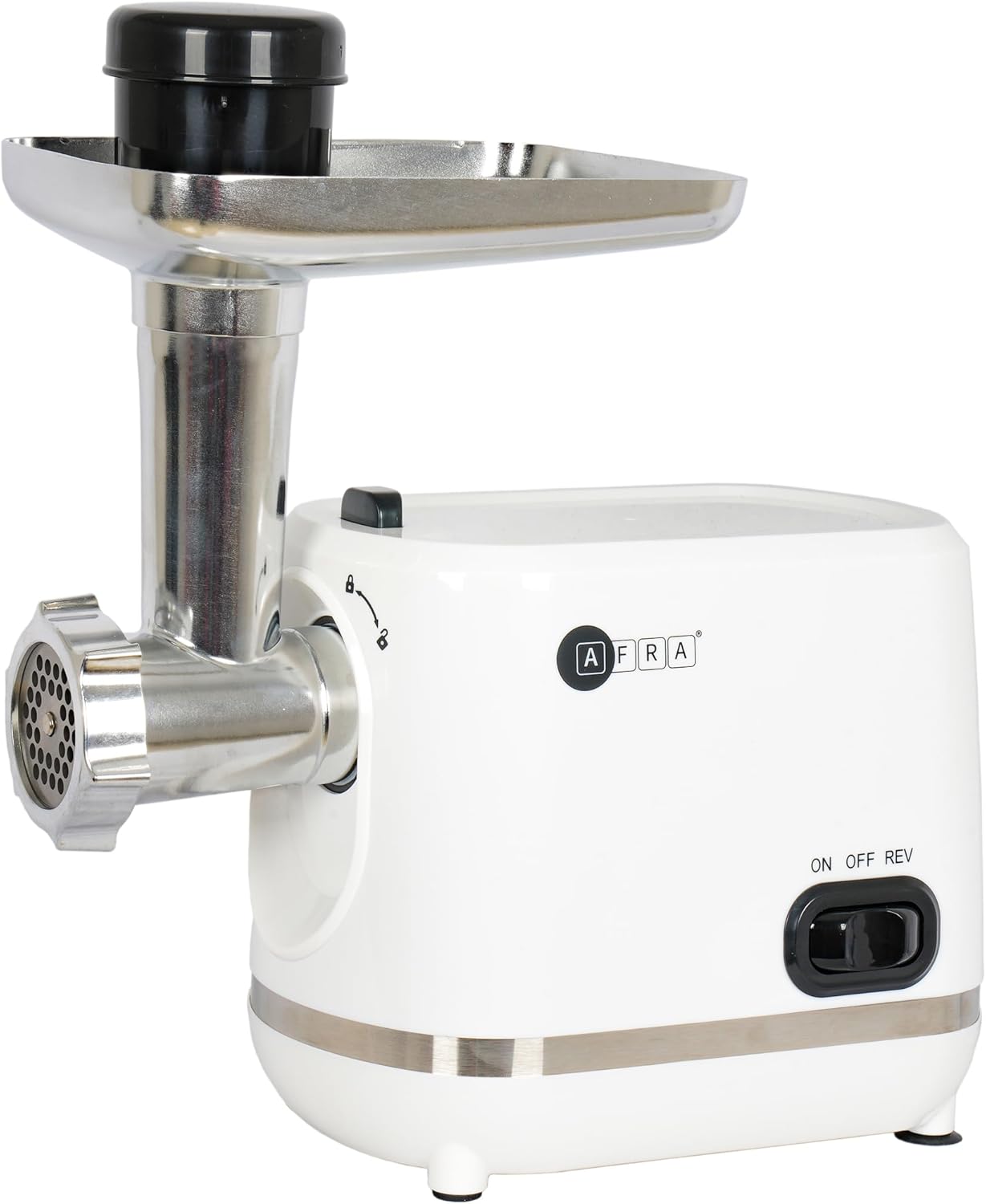The AFRA Meat Grinder delivers powerful 1200W performance, efficiently handling a variety of grinding tasks with three precision cutting discs. Its durable aluminum construction ensures longevity, while the stainless steel cross knife provides consistent, precise processing. Equipped with a food storage pusher, kibbeh and sausage attachments, it offers versatility for preparing diverse recipes with professional results. Designed for reliability and ease of use, this model is ideal for culinary experts seeking robust and efficient meat grinding in the kitchen.