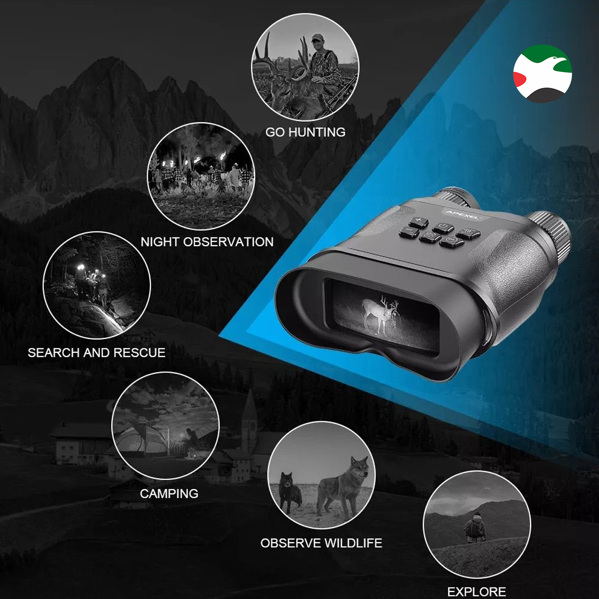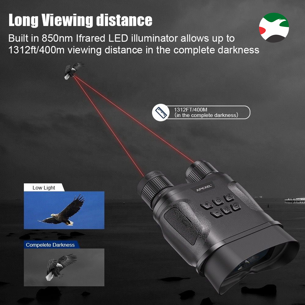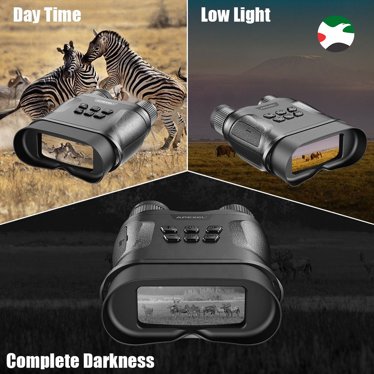 Apexel Digital Infrared night vision binoculars feature ultra-low light infrared illuminators that allow you to view and capture sharp photos and videos in the dark. You can save everything on a memory card. With infrared on, you can see in total darkness, and of course night vision telescopes can be used in daytime and low light conditions for hunting, wildlife observation, military reconnaissance security, search, camping, and exploration.