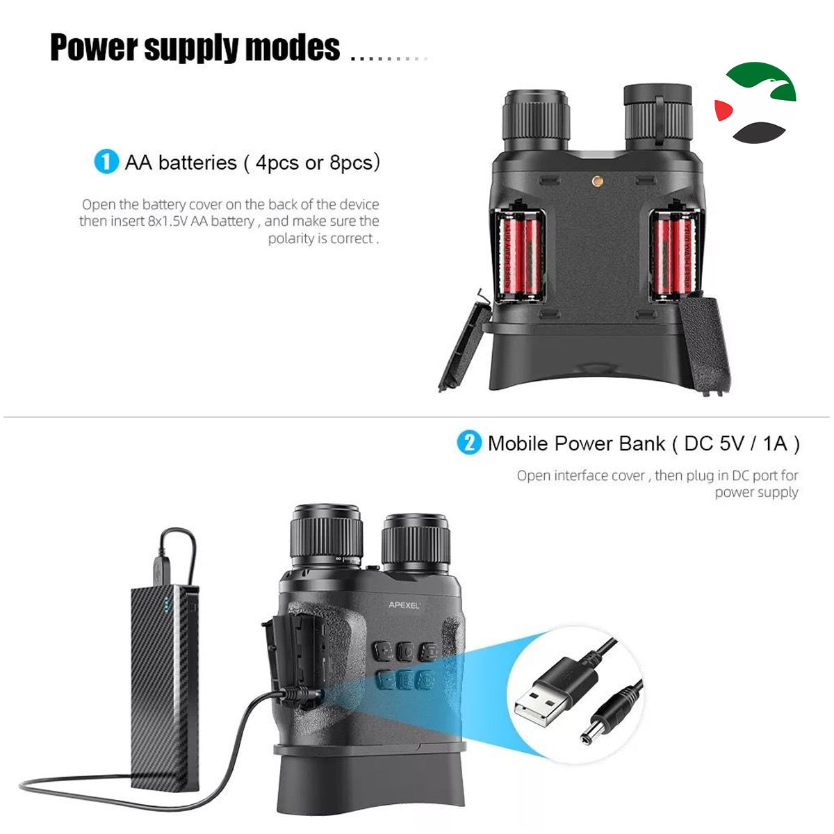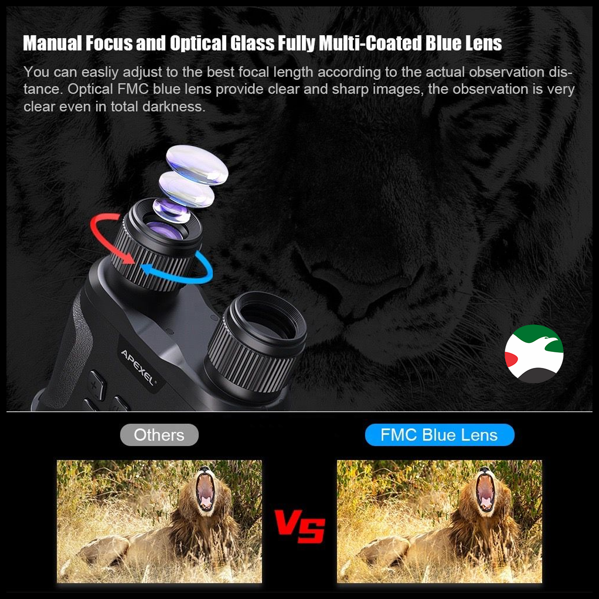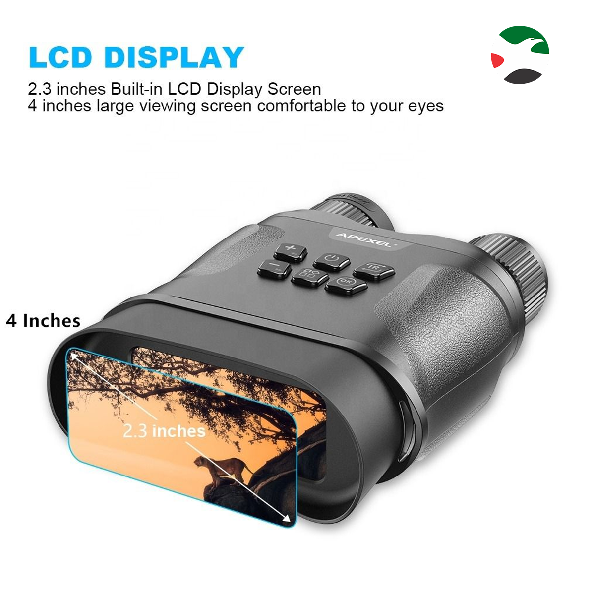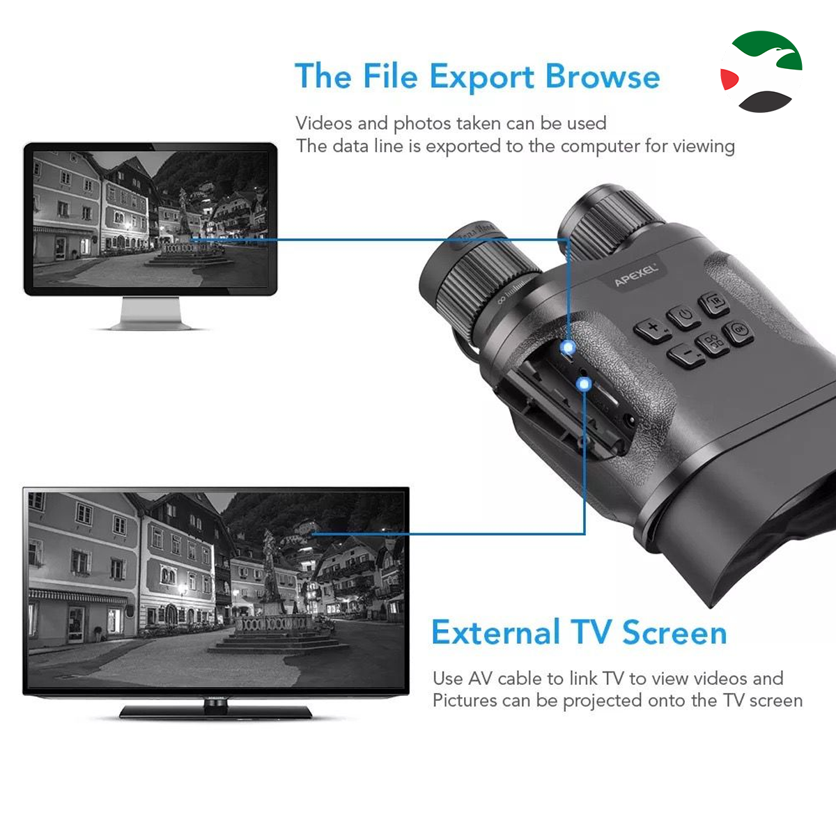 Apexel Digital Infrared night vision binoculars feature ultra-low light infrared illuminators that allow you to view and capture sharp photos and videos in the dark. You can save everything on a memory card. With infrared on, you can see in total darkness, and of course night vision telescopes can be used in daytime and low light conditions for hunting, wildlife observation, military reconnaissance security, search, camping, and exploration.