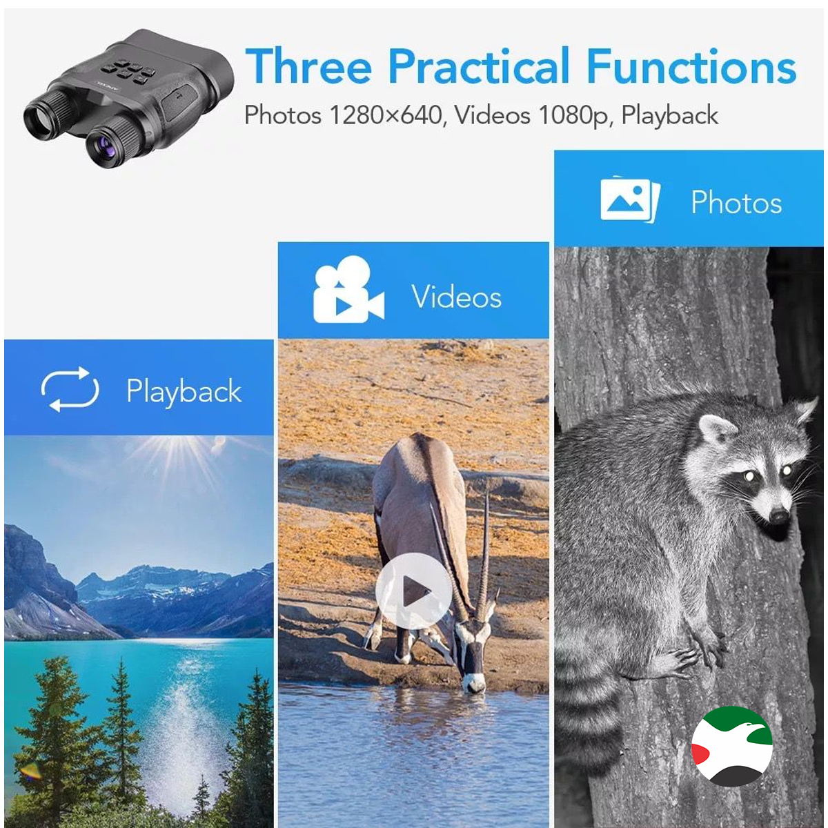 High-Resolution Video & Photos: Built-in digital camera, supports 2X optical zoom and 4X digital zoom, the night vision binoculars can take clear photos(max.1280 * 720dpi) and record HD videos(max. 1080P at 20fps); with 2.3 inches large LCD screen, easy for viewing and comfortable to eyes.