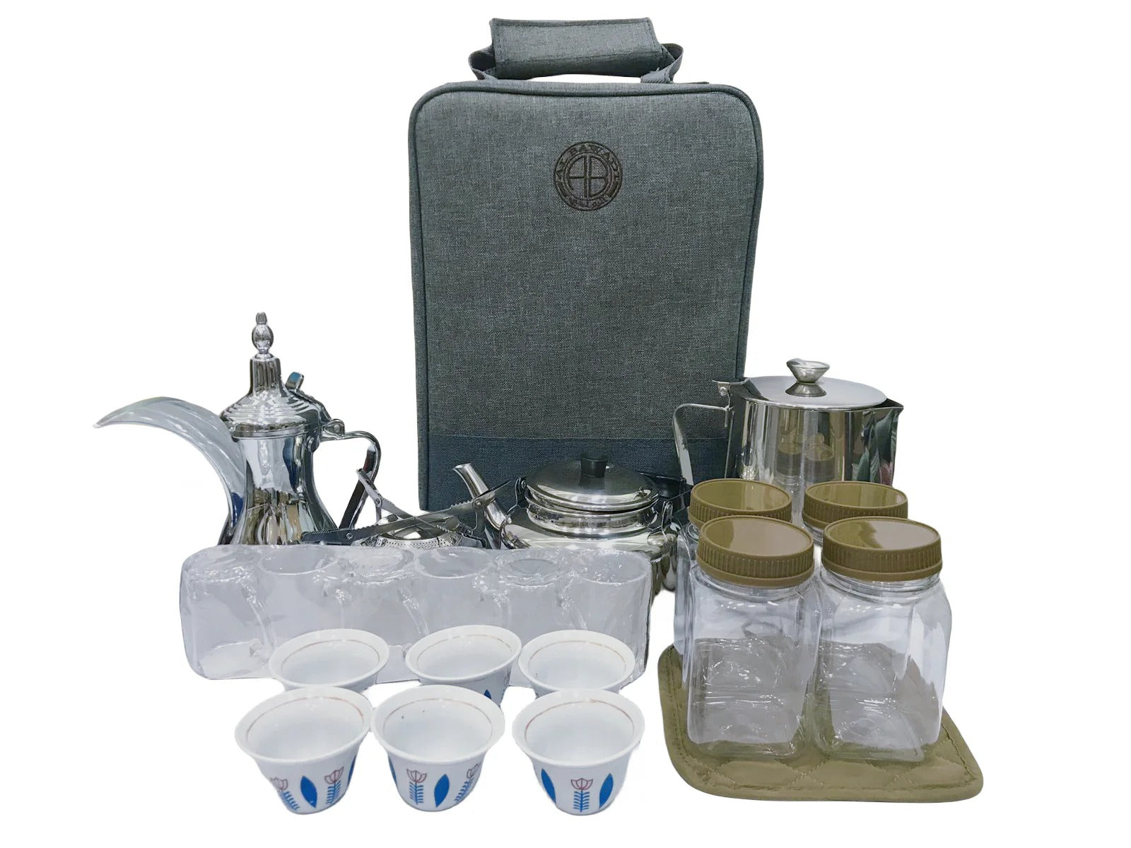 Experience traditional Arabic tea and coffee outdoors with this comprehensive camping kit. Featuring an efficient stove, teapot, cup, and windboard, it ensures optimal brewing even in windy conditions. The included bag offers easy portability, all crafted in a durable army camouflage design for discreet and rugged use. Ideal for campers seeking an authentic and convenient beverage experience in nature.
