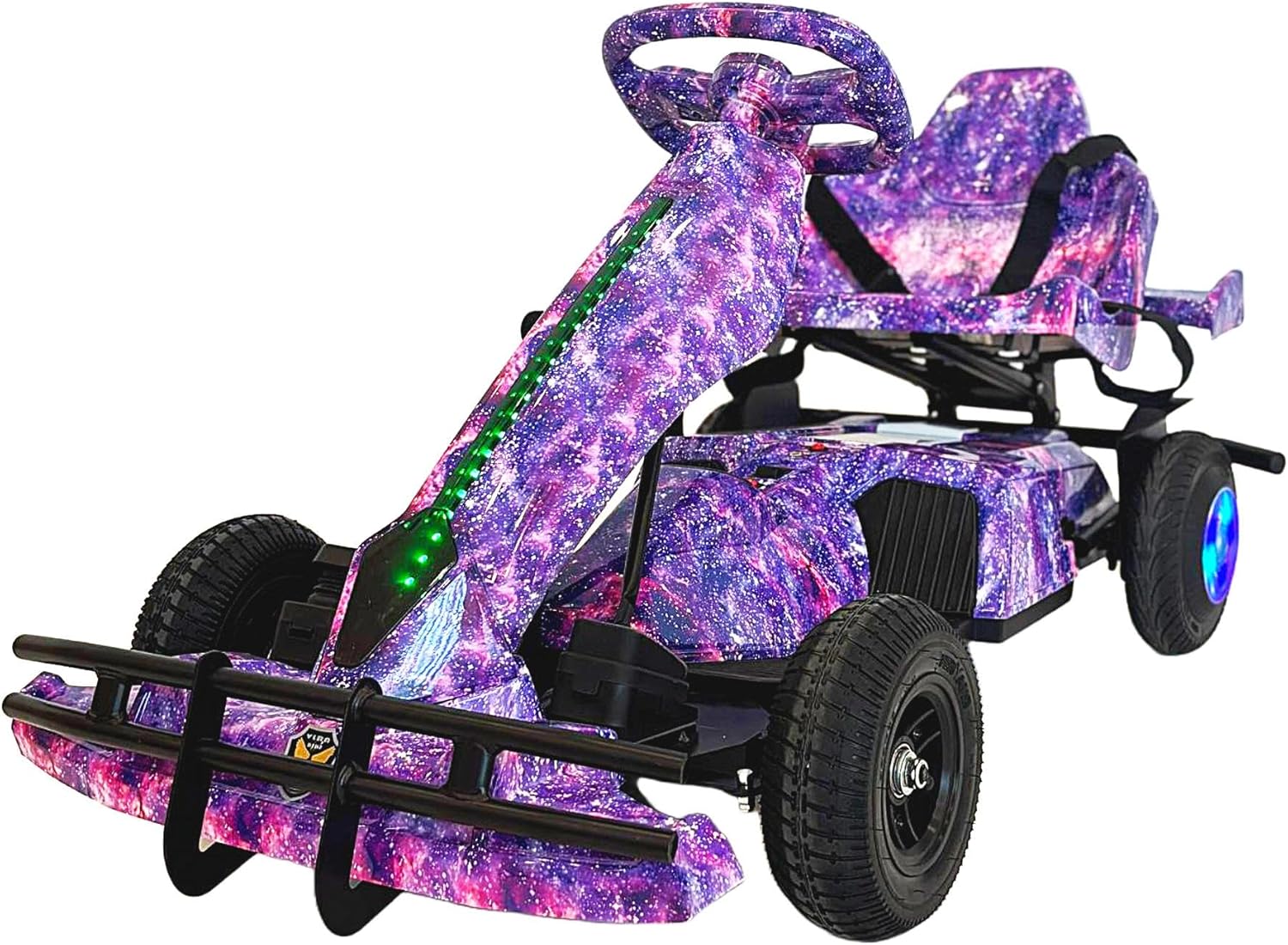 Blast off into adventure with this stunning galaxy-themed electric go-kart! The VLRA BIKE 36V kids' four-wheel electric vehicle combines pedal drive functionality with electric power for an exciting riding experience. Featuring a mesmerising cosmic purple design with pink nebula patterns, this go-kart stands out with its LED light accents that create an otherworldly glow. The sturdy construction includes robust rubber tyres, a comfortable seat with safety straps, and a durable frame built for endless fun. The unique hybrid pedal-electric drive system allows young riders to switch between powered and manual modes, promoting both active play and controlled cruising. With its sleek racing-inspired design, adjustable seat, and built-in safety features, this go-kart delivers an out-of-this-world riding experience that will captivate young racers. Perfect for outdoor adventures, this vehicle brings together style, safety, and excitement in one impressive package.