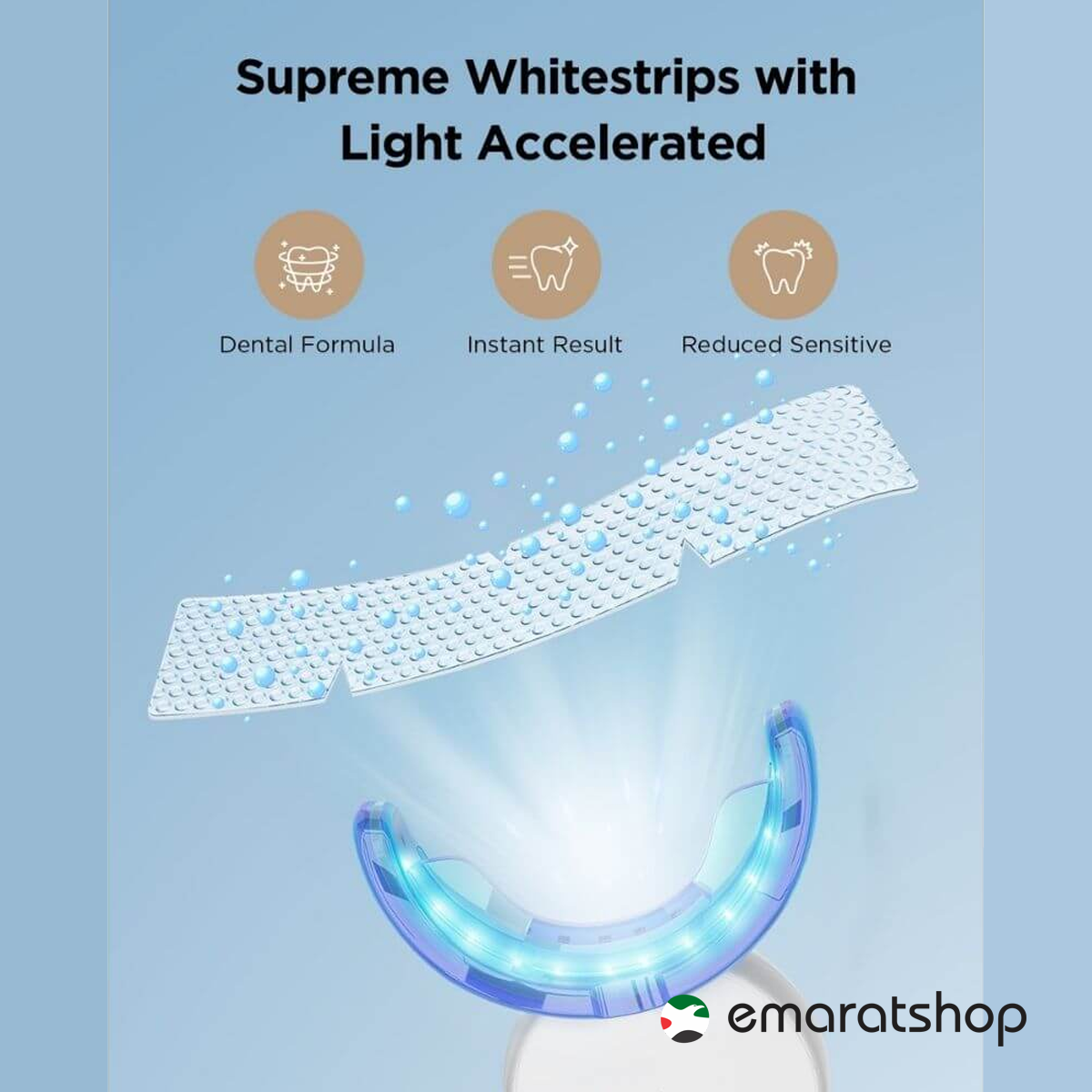The Accelerator whitening light activates and accelerates the teeth whitening strip, increasing the potency speed and results of the Super Whitening Strips. The combination of the whitening strips for teeth and the LED accelerator light come together to remove not only surface stains but stains embedded deep in the enamel for magnificent all-around whitening results. In only 10 to 20min see Visible results after only 2 to 3 uses, with long-lasting of 120 days or more with the full treatment.