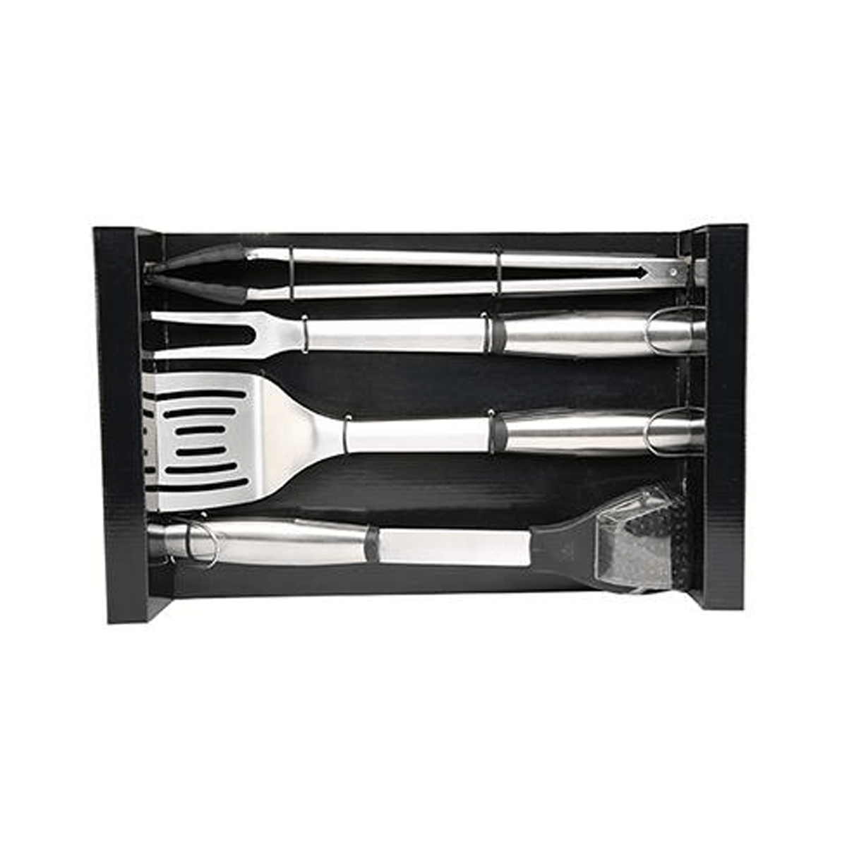 The 4 piece Epicurean toolset from GrillMark® features a turner, tong, brush and fork. These tools are constructed with high grade polished stainless steel. Soft grip rubber accents on handles offer a comfortable and easy grip. The high quality grill brush scrapes off all the residue and the silicone tip tongs offer heat resistance up to 500F. This set makes an ideal choice for the barbeque lover.