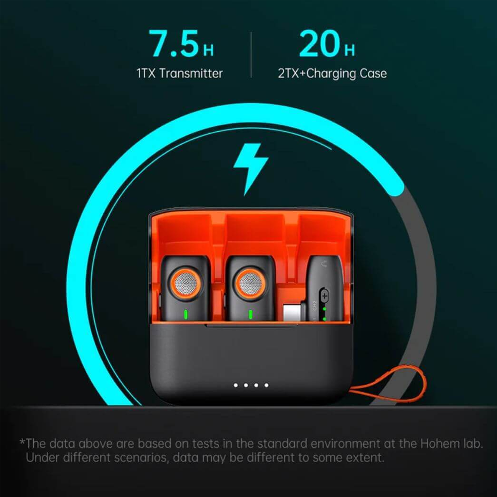 Forget about battery anxiety. Each transmitter provides up to 7.5 hours of battery life, with an additional 20 hours provided by the charging case. Whether it’s an extended shoot, a long lecture, or a marathon live session, this microphone is ready for the challenge.