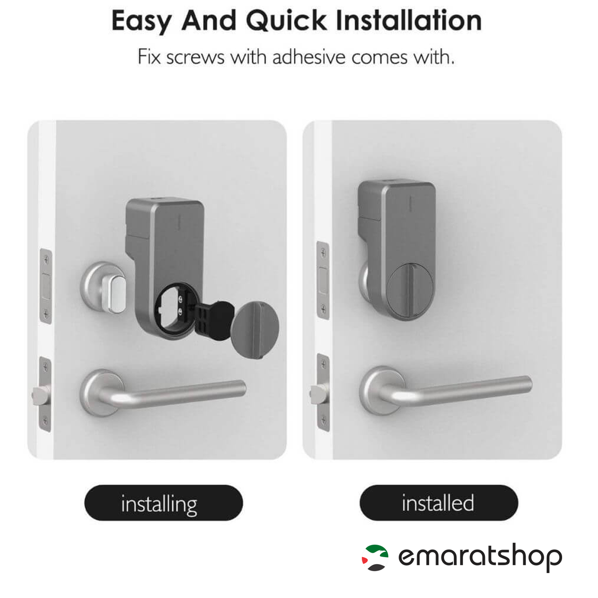 - EASY QUICK INSTALLATION: Simply peel and stick the smart lock to your door using durable but removable adhesive, you can also use the screws and screwdriver provided to reinforce the door lock, No modification is required of the current door lock and no impact on normal use of original locks and keys.