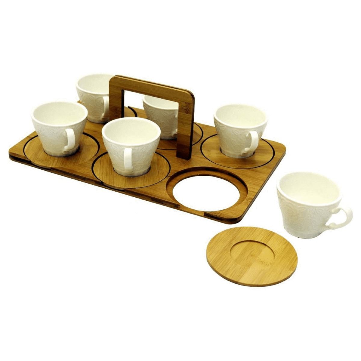 - 6 pieces porcelain cup, 6 pieces bamboo saucer & stand will complement on any home decor. This set is gift-boxed or for your personal needs, making it an ideal choice for special occasions such as weddings, housewarmings, and parties. Displayed neatly on a bamboo rack, these refined tea / coffee cups with bamboo saucers will exude luxury when entertaining.