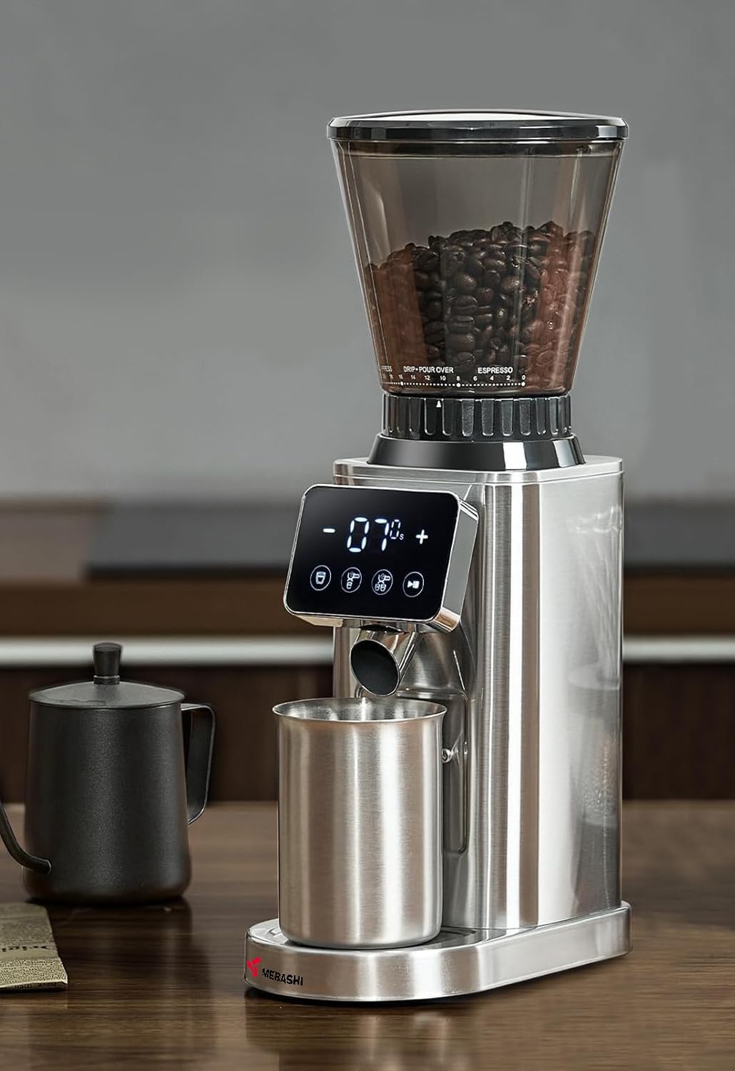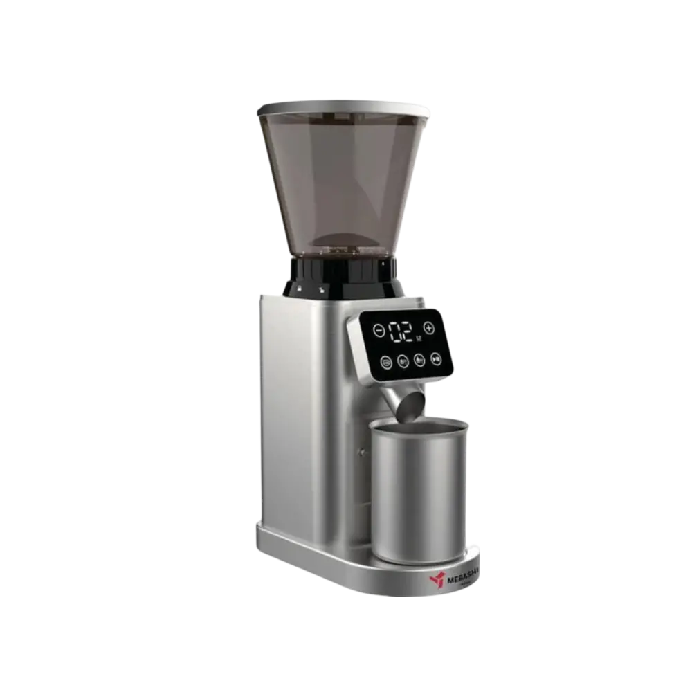 The MEBASHI Coffee Grinder (ME-CG2298) features a sleek digital touch screen for intuitive control and precision grinding. Equipped with 24 grind settings, it allows expert customization from coarse to fine, supporting a 300g bean capacity. Powered by a robust 180W motor housed in durable stainless steel, this grinder ensures consistent, high-quality results for coffee connoisseurs seeking optimal flavor extraction.