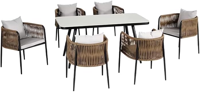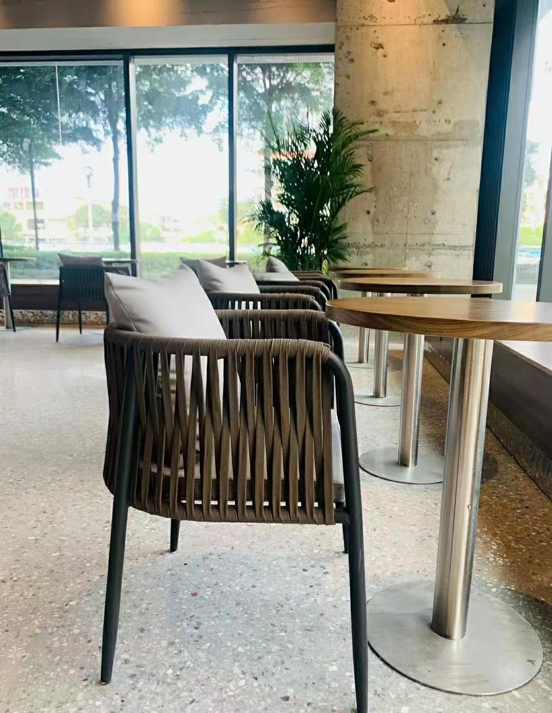 The Olmecs Nordic Leisure Outdoor Furniture Metal String Bistro Chair combines a sleek metal frame with a woven braided cafe rope design, offering both durability and comfort. Its ergonomic shape, paired with a soft cushion, makes it ideal for relaxing in gardens, balconies, or dining rooms. Designed for both residential and restaurant settings, this chair balances modern aesthetics with practical outdoor use, ensuring long-lasting style and support.