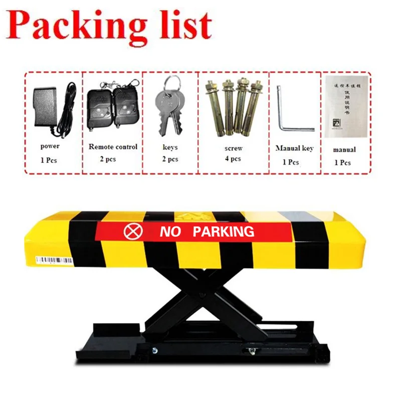 7.Package list: 1 parking barrier, 2 remote controls, 1 charger, no battery, 4 mounting screws, 2 keys.