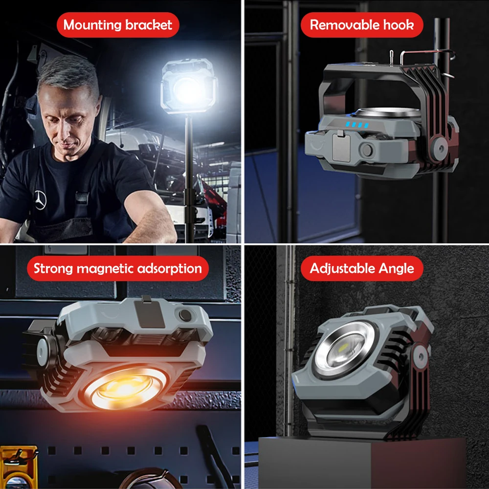 Adjustable Brightness Modes --- The work light has two light control switches. 1. Briefly press switch B to switch the light source, turning the front floodlight to the rear spot light mode to turn off; 2. Press the switch to adjust the brightness of the COB floodlight; 3. Press switch B to adjust the color temperature of the COB floodlight or adjust the spot light brightness; 4. When the light is off, double-click switch B to turn on the red light.