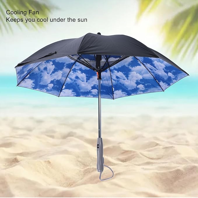 1. Cooling Fan: Travel umbrella is equipped with three high speed foldable fan blades and a mesh net for safety, our sun umbrella keeps you cool under the sun.