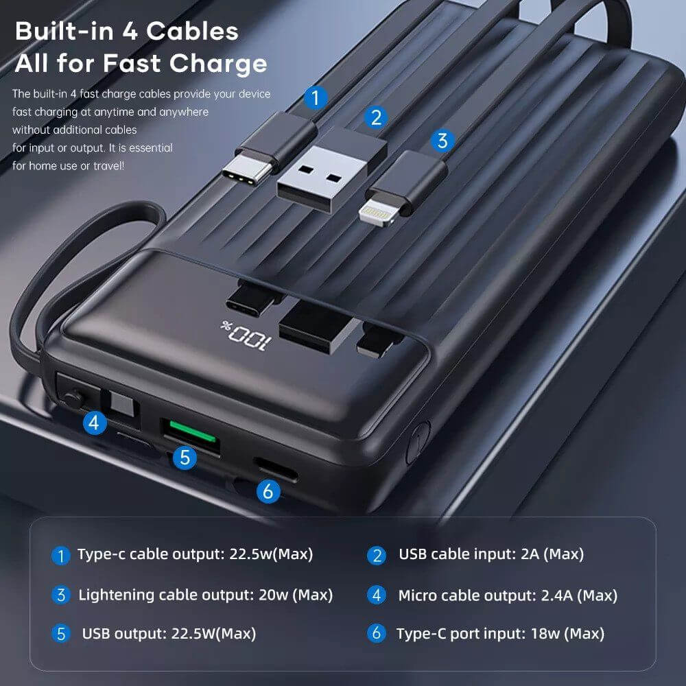 In conclusion, the ROCK P80 is a fast-charging power bank that is portable, versatile, and convenient to use. With its four cable output interfaces, two input interfaces, quick charge support, LED display, and 20000mAh battery capacity, it is an excellent device to have when you are on the go and need to charge multiple devices at the same time.