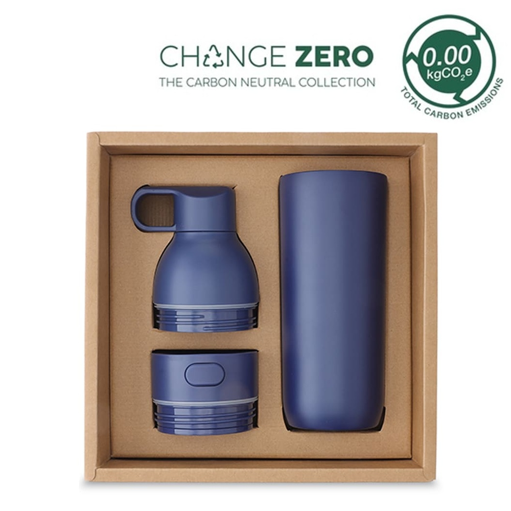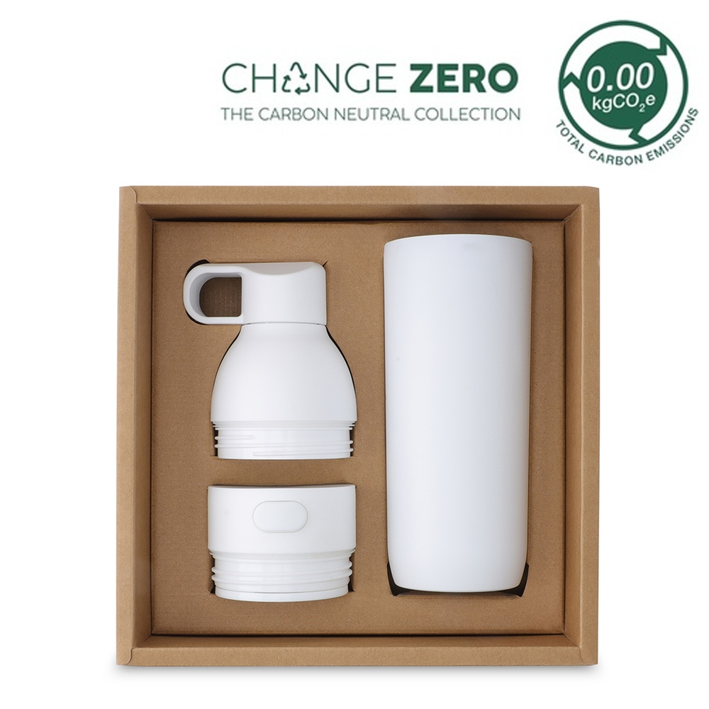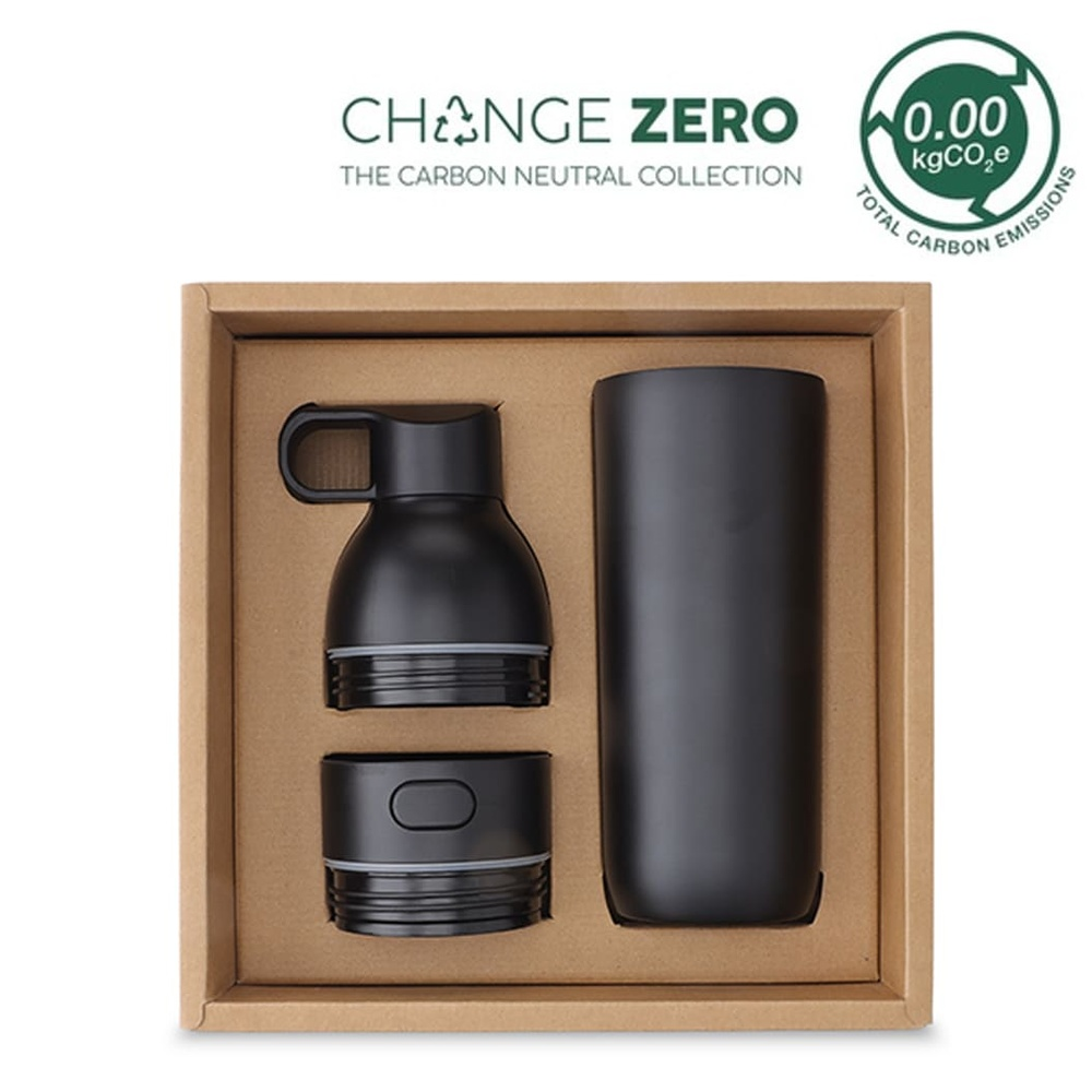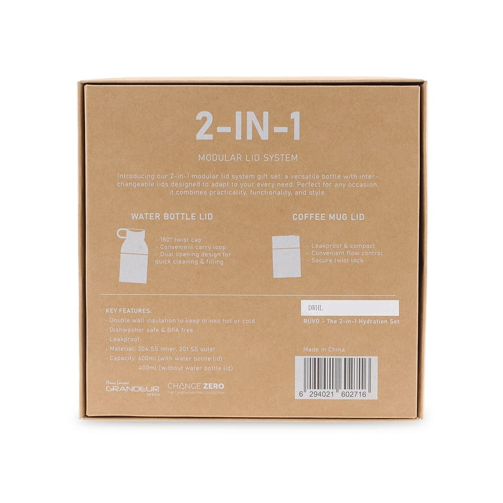 RUVO by Hans Larsen is a 2-in-1 modular hydration set with interchangeable water bottle and leakproof coffee tumbler lids, double walled vacuum insulated stainless steel (SS304 inside and outside) and robust construction quality. Switch comfortably between both lid types for a bottle or tumbler drinking experience. This set is perfect for drinks of all temperatures, and the wide mouth makes it easy to add ice cubes. Packed in a sustainable, recyclable kraft box. This set is a CHANGE ZERO product, which means that it is developed with a net zero carbon footprint - we have measured and offset the carbon footprint of -3.4 kgCO2eq per unit by financing renewal energy projects through Climate Partner, making it a carbon-zero gift.