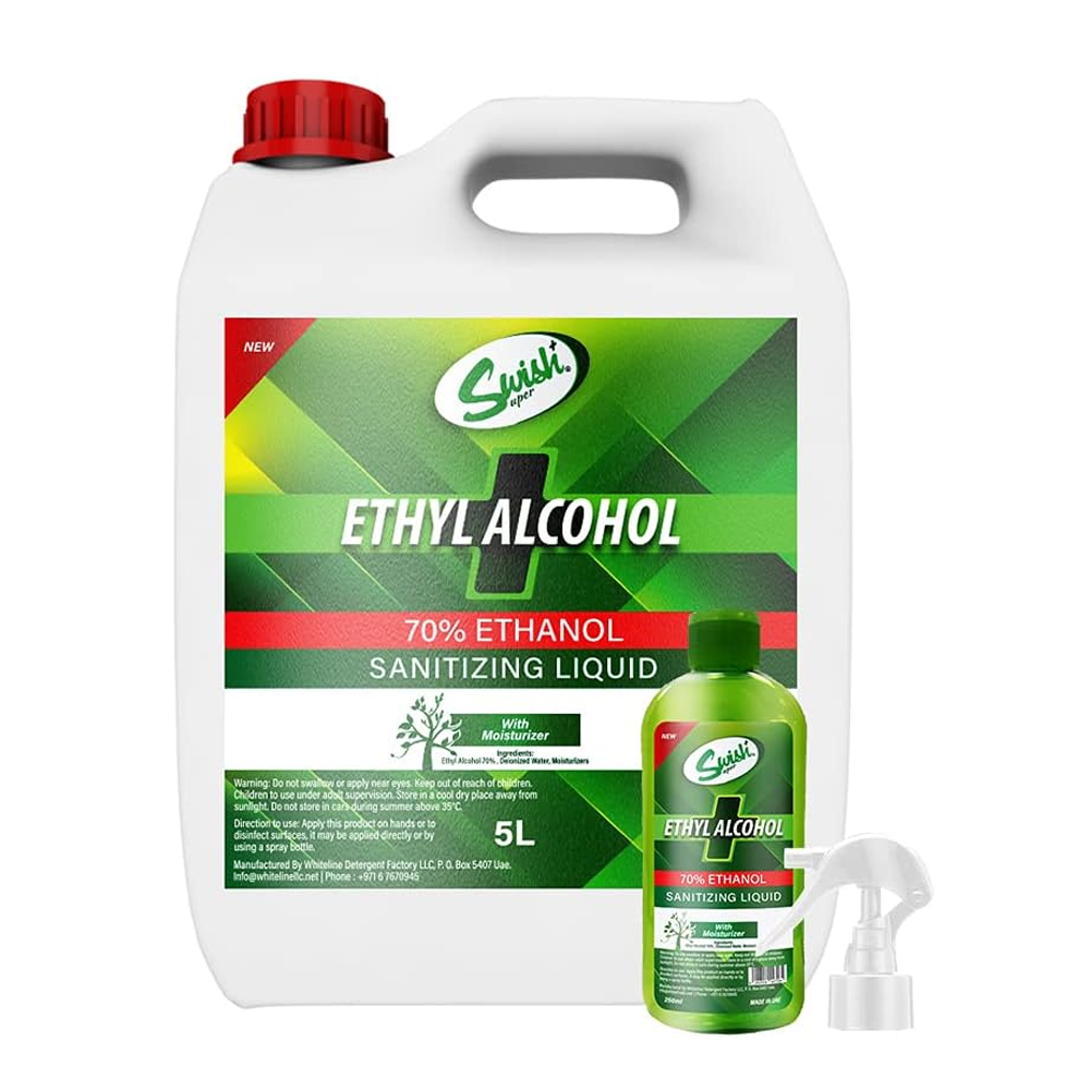 Swish Ethyl Alcohol 70% , Ready to use - Sanitizes Hands -Can be used as rubbing alcohol -Mild fragrance -With moisturizers -Contains a 5L Refill can , A 250ml bottle + a separate sprayer. Can be used for disinfecting surfaces . Appearance - Clear and colourless liquid
