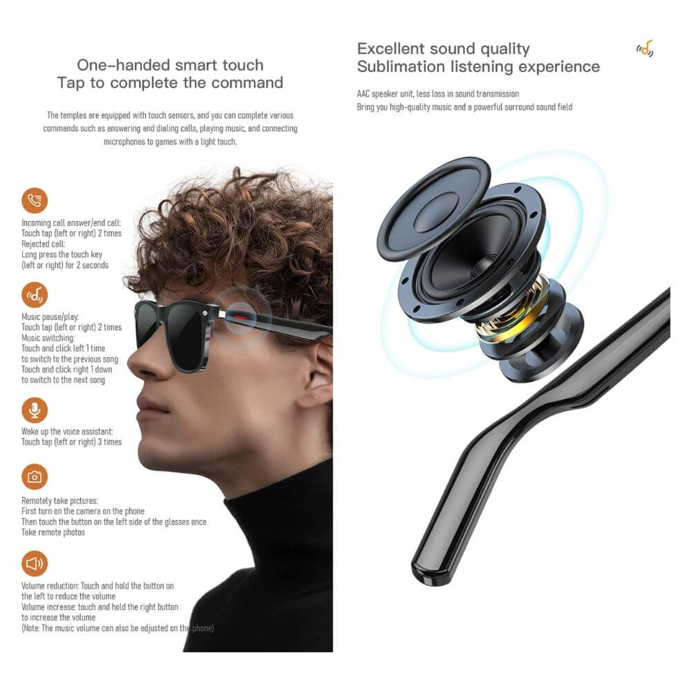 - Touch-Enabled: Change music tracks, play or pause media, manage calls, and even take selfies with the touch-enabled functionality of these smart glasses.