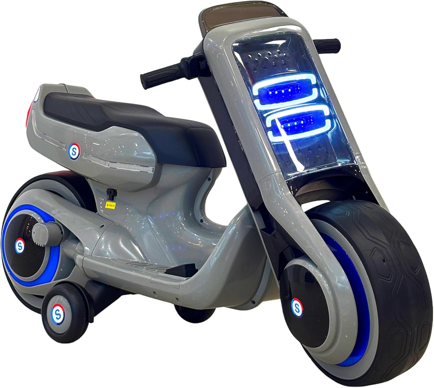 Introducing the VLRA Kids Electric Motorcycle in striking lime green - a thrilling ride-on toy that combines style with safety. This miniature motorcycle features stabilising training wheels, making it perfect for young riders learning to balance. The sleek design is enhanced with impressive LED lighting systems, including blue accent lights and red tail lights for added visibility and style. The motorcycle comes equipped with a modern dashboard display that adds to the realistic riding experience. The comfortable seat and ergonomic handlebars ensure a cosy ride, while the durable wheels provide smooth movement across surfaces. This rechargeable electric ride-on toy offers the perfect blend of excitement and security for young riders. The eye-catching lime green colour scheme with cream accents creates a fresh, modern look that children will love. Perfect for developing coordination skills while providing hours of entertainment, this electric motorcycle brings the thrill of riding to your little one's playtime adventures.